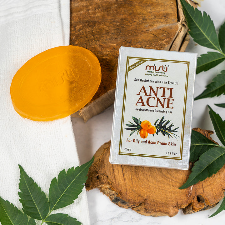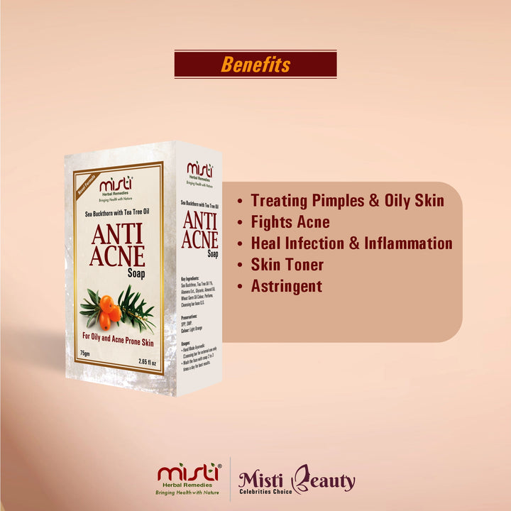 BENEFITS OF MISTI’S ANTI-ACNE SOAP: Misti’s Anti-acne soap is exclusively designed to heal inflammation and skin infections with the potential to remove dirt and extra oil from the skin which ultimately contributes to reducing acne breakouts. It is made with the purest quality Sea Buckthorn and Tea tree oil which helps to get rid of the fight against dark spots and removes dead skin cells rendering skin smooth and pigmentation. The gentle aroma aids in relieving anxiety and promotes relaxation.
