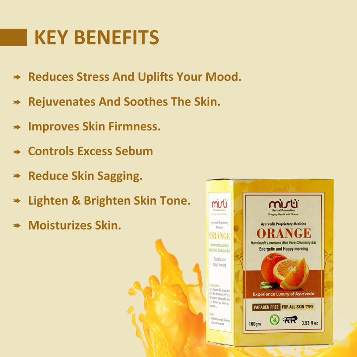 BENEFITS OFMISTI’S HANDMADE ORANGE BAR: Misti’s Luxurious Ayurvedic handmade Orange Bar helps to relieve stress and anxiety which helps to organize your whole day with energy and positivity. Orange rejuvenates and soothes theskin. It is considered a boon for the skin as it treats blackheads and blemishes. It may workas an effective exfoliating agent that helps in removing blackheads and unclogging the skin’s pores. Due to its cleansing, anti- inflammatory, antibacterial, and antifungal properties, orange helps to get rid of pimples and acne and allows them to heal faster.