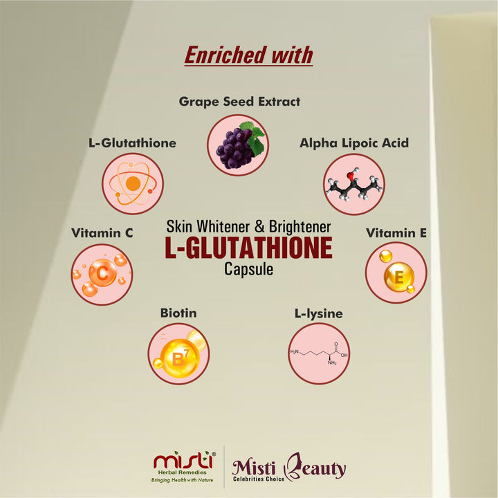 BENEFITS OF MISTI’S GLUTATHIONE CAPSULES: Misti’s glutathione capsules work on the basic glutathione mechanism. Glutathione naturally produces in the human body from the Liver but its level declines with age and leads to age lines and wrinkles because of a reduction in collagen fibers in the skin.