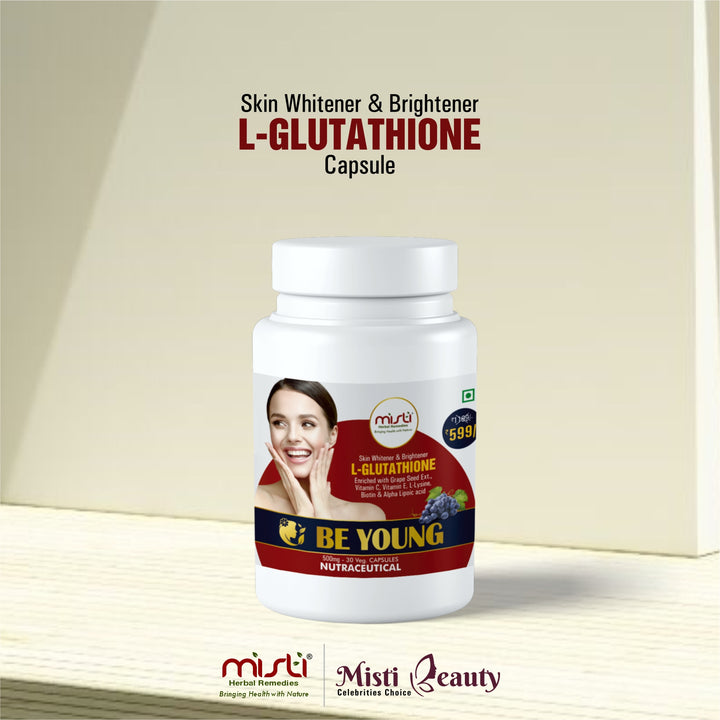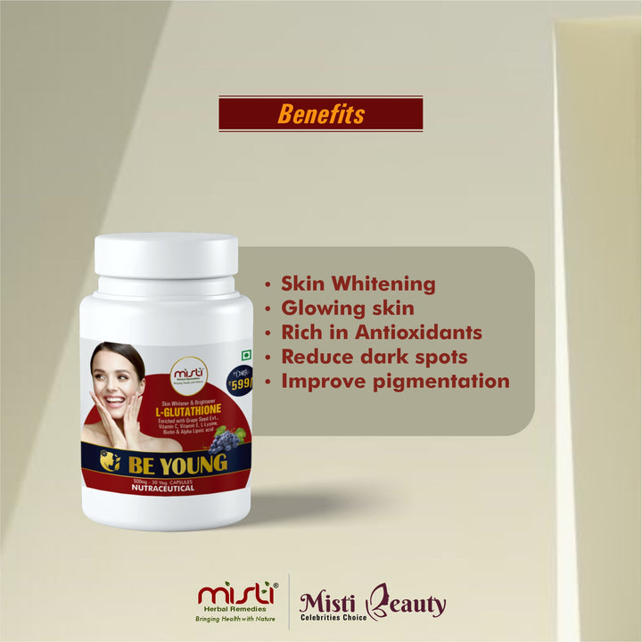 HOW TO USE: Take capsule of Misti’s Be Young L- Glutathione capsules Two Times In a day along with at least 4 liters of water a day and vitamin-enriched food and 7-8 hours of sleep per night.