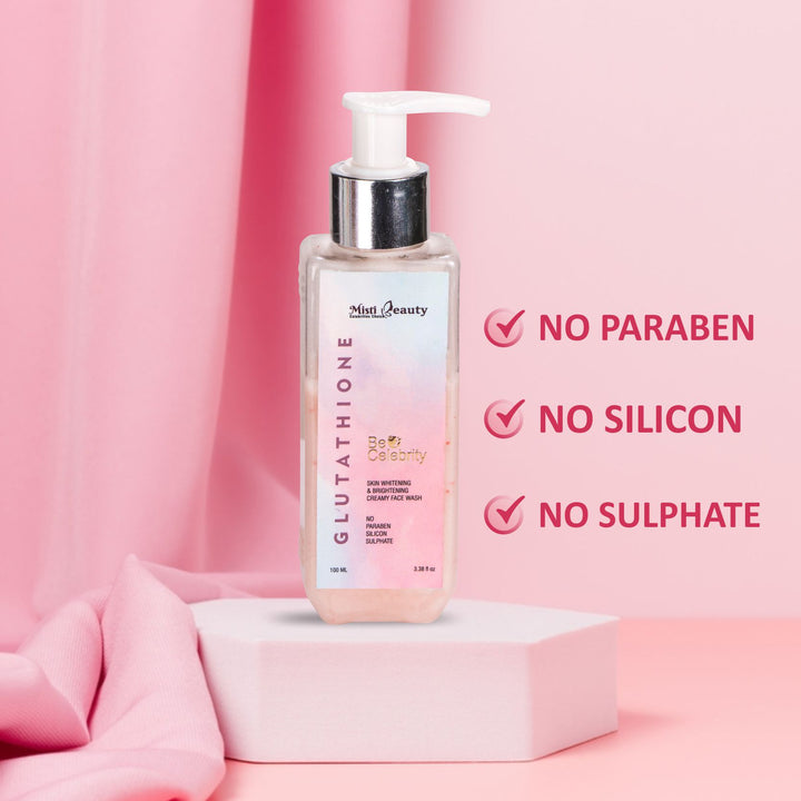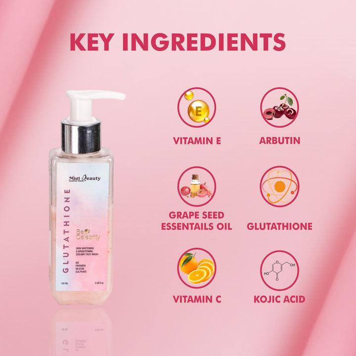 BENEFITS OF MISTI’S GLUTATHIONE CREAMY FACE WASH: Misti Beauty Be celebrity Glutathione creamy face wash helps to restore the youthful glow of the skin and effectively reduces wrinkles and fine lines with a boost in the production of collagen which is an essential factor in skin tightening. Glutathione imparts skin- lightening and anti-aging benefits. Our face wash removes dirt, excess oils, and dead tissue layer which leads to an effective reduction in acne breakouts and further reduces acne scars and dark spots.
