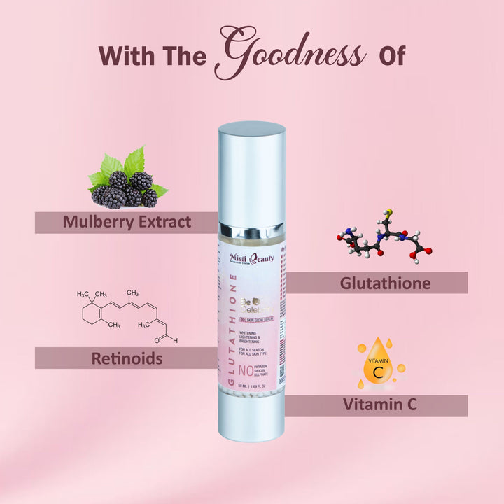 BENEFITS OF MISTI’S GLUTATHIONE 3D GLOW SERUM: Misti Beauty Be celebrity 3D skin glow serum rich in vitamin C, E, and pro-vitamin B content helps to regain the skin’s natural youth back. It helps to reduce dark spots, slow down the ageing process, decrease UV damage to skin, and makes the skin softer, lighter, whitener and brighter.