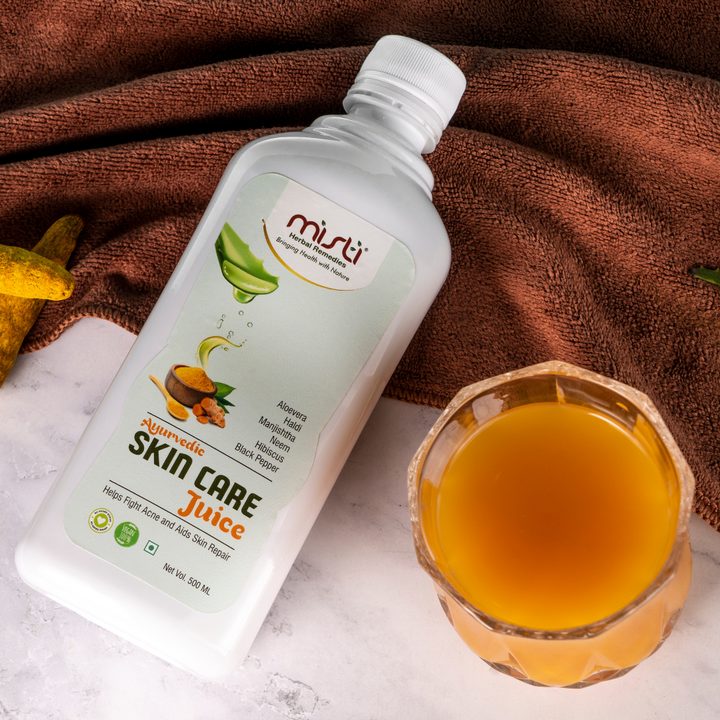 BENEFITS OF MISTI’S SKIN CARE JUICE: Misti’s Ayurvedic skin care juice is made of the purest ayurvedic herbs namely Aloe Vera, Turmeric, Neem, and Manjishtha which are known to provide overall nourishment to the skin and specifically control acne breakouts and oily skin.