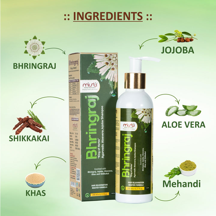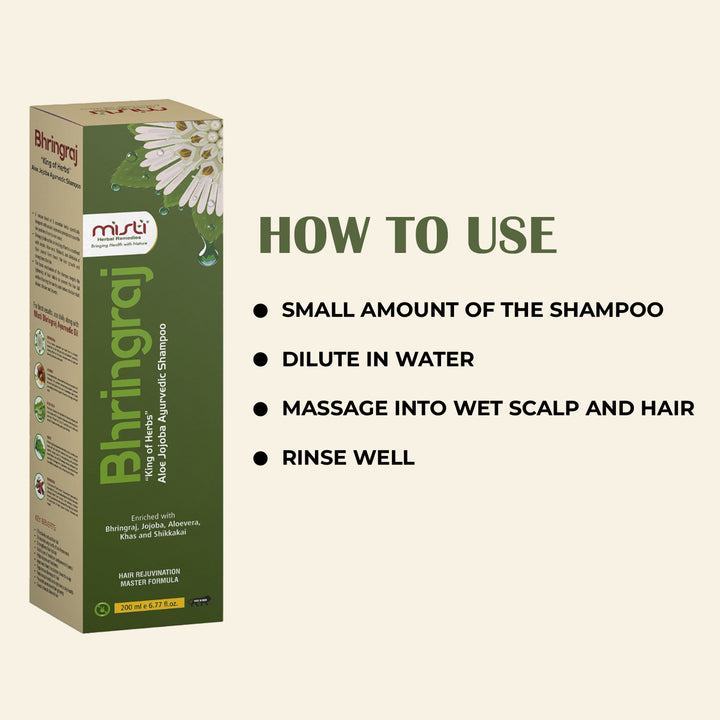 BENEFITS OF MISTI’S BHRINGRAJ SHAMPOO: Misti’s Bhringraj “Kings of Herbs” Aloe Jojoba Ayurvedic Shampoo effectively reduces hair fall & nourishes your hair resulting in stronger hair with more volume. It is loaded with vital nutrients and Ayurvedic herbs for hair growth, helps rejuvenate the hair from roots to tips, strengthens the strands and boosts hair growth.